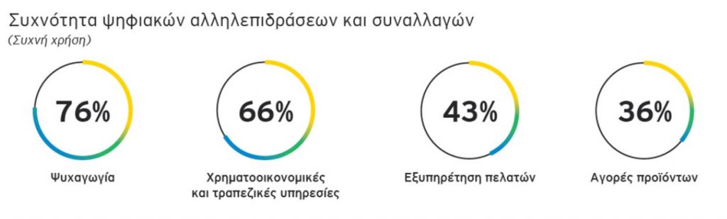 Η τεχνολογία έχει γίνει αναπόσπαστο μέρος της καθημερινότητας του Έλληνα καταναλωτή, με τη συχνή χρήση online υπηρεσιών να είναι πιο εμφανής στον τομέα της ψυχαγωγίας (76%) και στις χρηματοοικονομικές και τραπεζικές υπηρεσίες (66%). Σε μικρότερο βαθμό χρησιμοποιούνται οι διαδικτυακές πλατφόρμες για εξυπηρέτηση πελατών (43%) και για online αγορές (36%).