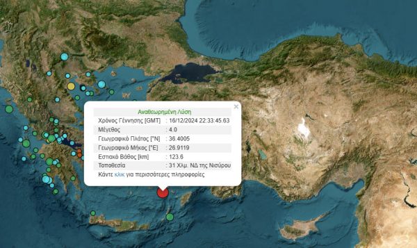 Σύμφωνα με το Γεωδυναμικό Ινστιτούτο του Εθνικού Αστεροσκοπείου Αθηνών, ασθενής σεισμική δόνηση 4 Ρίχτερ καταγράφηκε στις 00:33 σήμερα Τρίτη, με το επίκεντρό της να εντοπίζεται σε απόσταση 31 χιλιομέτρων νοτιοδυτικά της Νισύρου, ή 333 χλμ. ανατολικά-νοτιοανατολικά της Αθήνας.