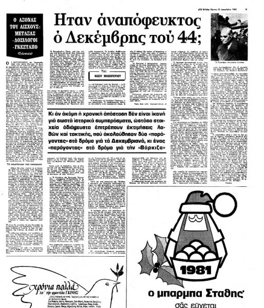 *Απόσπασμα από εκτενές άρθρο του αειμνήστου δημοσιογράφου και συγγραφέα Βάσου Μαθιόπουλου (1928-2013), που αφορούσε τα Δεκεμβριανά και είχε δημοσιευτεί στην εφημερίδα «Το Βήμα» πριν από 44 χρόνια, την ημέρα των Χριστουγέννων του 1980.