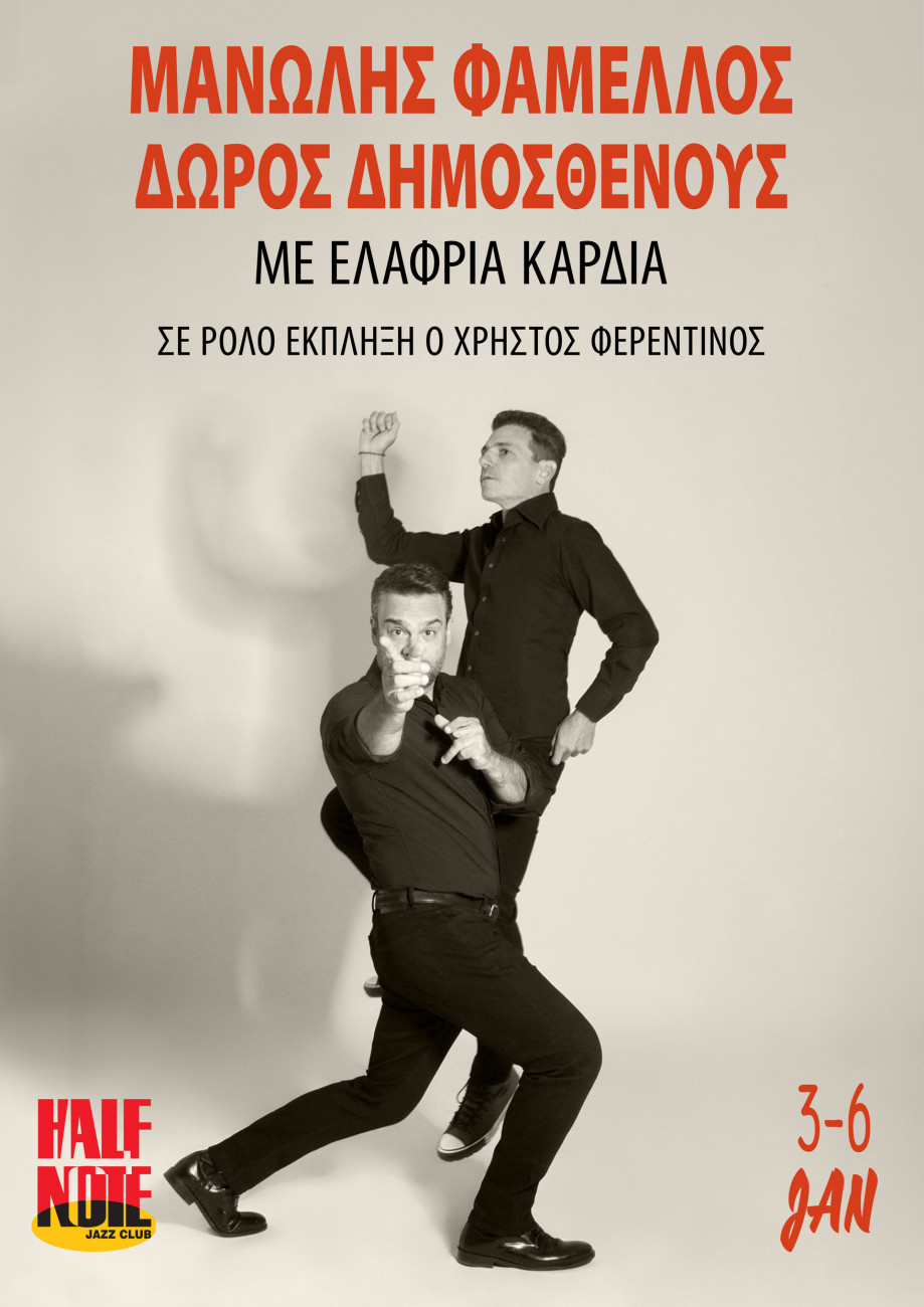 Το «Με ελαφριά καρδιά» έρχεται στο Half Note από την Παρασκευή 3 έως και τη Δευτέρα 6 Ιανουαρίου 2025.