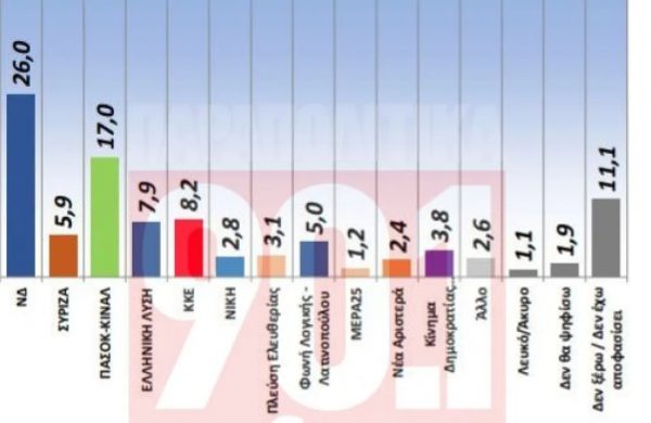 Σύμφωνα με τα αποτέλεσμα δημοσκόπησης της GPO για τα Παραπολιτικά 90,1, στην πρόθεση ψήφου η ΝΔ λαμβάνει 26% ενώ το ΠΑΣΟΚ βρίσκεται στη δεύτερη θέση με 17% με τη διαφορά να καταγράφεται στις 9 ποσοστιαίες μονάδες.
