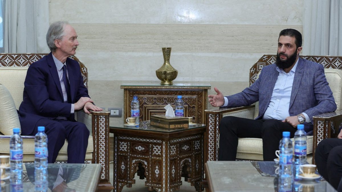 Ο απεσταλμένος του ΟΗΕ για τη Συρία Γκέιρ Πέντερσεν συναντάται με τον επικεφαλής της Χαγιάτ Ταχρίρ αλ Σαμ και ντε φάκτο ηγέτη της Συρίας, Αχμέντ αλ Σαράα, επίσης γνωστό ως Αμπού Μοχάμεντ αλ Γκολάνι στη Δαμασκό της Συρίας σε αυτό το ενημερωτικό δελτίο που δημοσιεύτηκε στις 15 Δεκεμβρίου 2024.