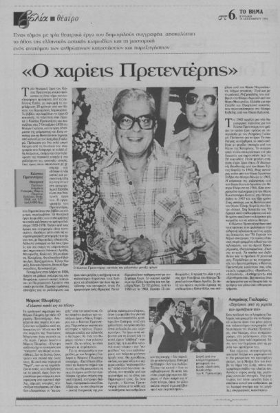 Ένα άρθρο του «Βήματος» που είχε κυκλοφορήσει την Κυριακή 20 Δεκεμβρίου 1998 ήταν αφιερωμένο στην προαναφερθείσα έκδοση, και μαζί ασφαλώς στη μνήμη του χαρισματικού συγγραφέα. Σε αυτό σκιαγραφείται η έντονη δράση του Πρετεντέρη κατά τη διάρκεια του βραχέος βίου του (απεβίωσε σε ηλικία μόλις 52 ετών): 55 θεατρικά έργα (κωμωδίες και επιθεωρήσεις) από το 1953 έως το 1978, μεγάλες ραδιοφωνικές και τηλεοπτικές επιτυχίες, πληθώρα ευθυμογραφημάτων σε αθηναϊκές εφημερίδες.