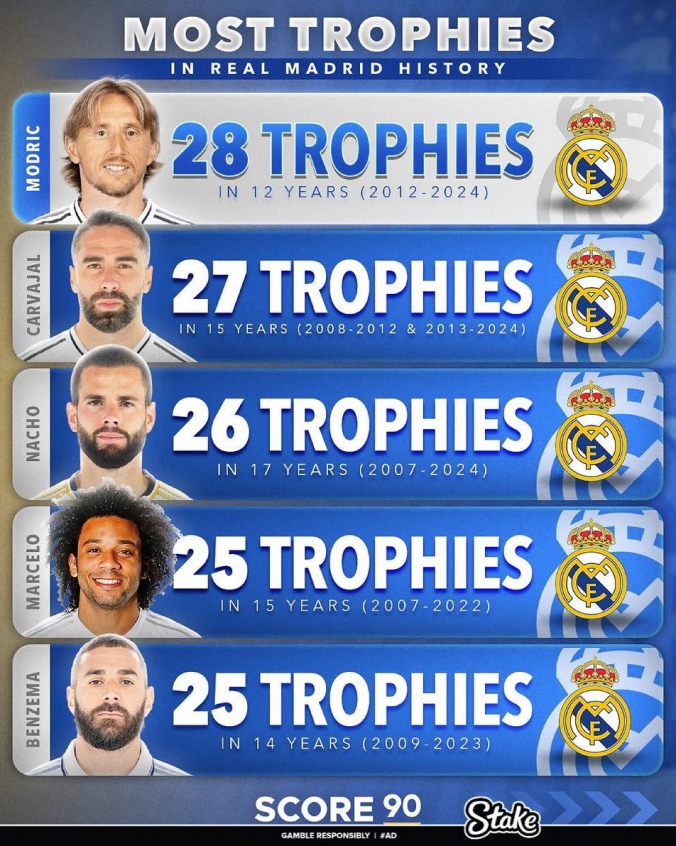 Με την κατάκτηση του 28ου τροπαίου ο Λούκα Μόντριτς άφησε πίσω τον Ντάνι Καρβαχάλ που είχε 27 τίτλους σε 15 χρόνια στη Ρεάλ. Μετά έρχονται o Nάτσο με 26 τίτλους σε 17 χρόνια και οι Μαρσέλο και Μπενζεμά με 25 τρόπαια, ο πρώτος σε 15 χρόνια και ο δεύτερος σε 14.