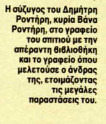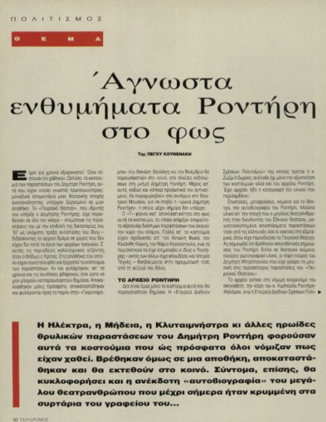 *Απόσπασμα από άρθρο που έφερε τον τίτλο «Άγνωστα ενθυμήματα Ροντήρη στο φως» και είχε δημοσιευτεί στον «Ταχυδρόμο» την 1η Ιουλίου 1992.