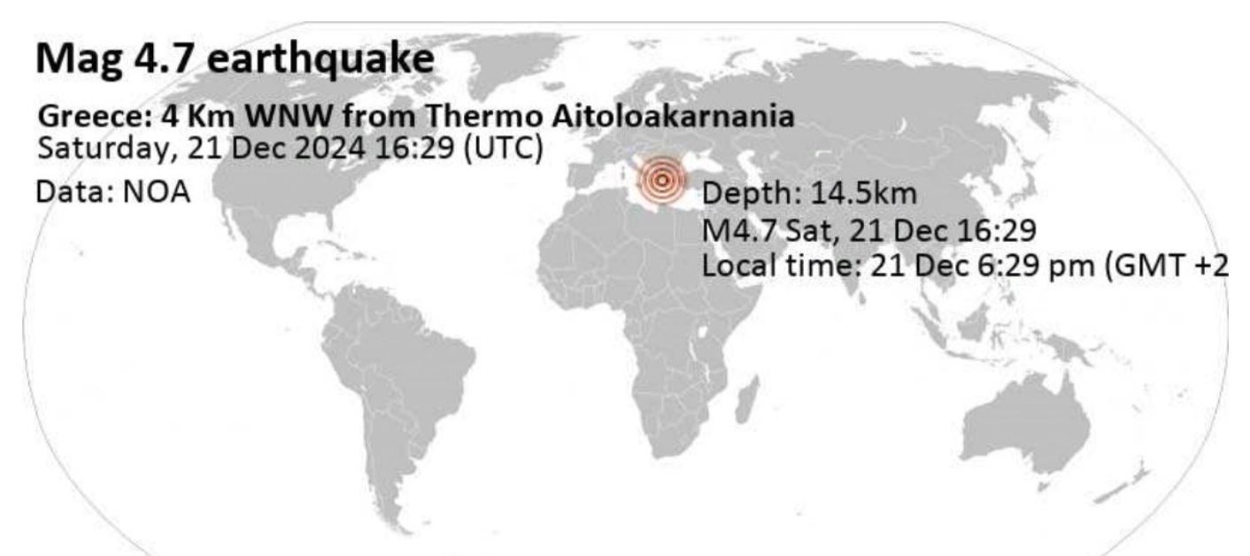 Υπενθυμίζεται ότι το επίκεντρο του σεισμού εντοπίζεται περίπου 18 χιλιόμετρα νοτιοανατολικά του Αγρινίου, κοντά στο Θέρμο Αιτωλοακαρνανίας, ενώ το εστιακό βάθος της δόνησης εκτιμάται στα 18 χιλιόμετρα.