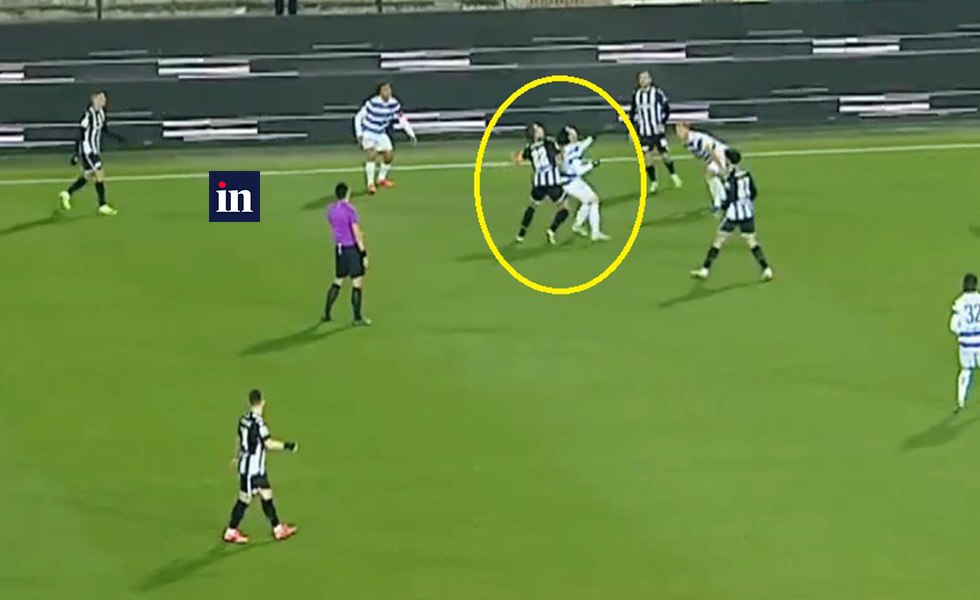 Σε μια διεκδίκηση της μπάλας στα μισά του γηπέδου λοιπόν, ο Αθανασίου έχει πίσω του τον Σβαμπ του ΠΑΟΚ. Δεν τον βλέπει και προσπαθώντας να κοντρολάρει τη μπάλα τον βρίσκει στο μέτωπό.