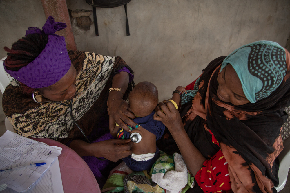 Ιατρικές δραστηριότητες για τον πληθυσμό στο Μασακόρι. Η Ndoungamandji Solange, νοσηλεύτρια των Γιατρών Χωρίς Σύνορα εξετάζει έναν μικρό ασθενή. –Ιανουάριος 2024 -Τσαντ.