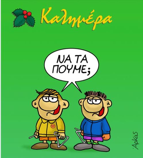 Ο Αρκάς στο σημερινό σκίτσο του μας παρουσιάζει τα δύο αγόρια με τα κάλαντα στα χέρια, έτοιμα να μας πουν τα κάλαντα των Χριστουγέννων.
