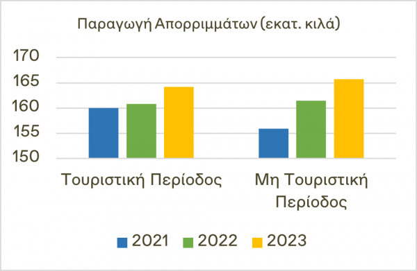 Σύμφωνα με τα στοιχεία (2021-2023) παρατηρήθηκε διαχρονική αύξηση του συνολικού όγκου απορριμμάτων κατά την τουριστική και μη τουριστική περίοδο, σε ποσοστά 2,6% και 6,3% αντίστοιχα. Τη μεγαλύτερη πίεση από τον τουρισμό υφίστανται η 1η, 2η και 3η δημοτική κοινότητα, ενώ στην 1η δημοτική κοινότητα περισσότερο από το 50% της συνολικής παραγωγής απορριμμάτων, κατανάλωσης ενέργειας και νερού προέρχεται διαχρονικά από τους επισκέπτες.