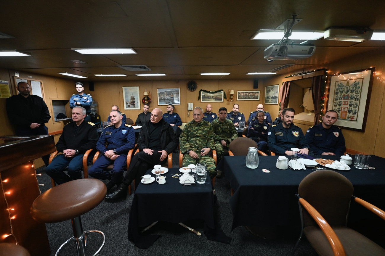 «Ήρθα με τον Αρχηγό ΓΕΕΘΑ Στρατηγό Χούπη και τον Αρχηγό ΓΕΝ Ναύαρχο Κατάρα, για να μείνουμε ένα βράδυ με το πλοίο που έχει υπηρεσία και να σας ευχηθούμε “χρόνια πολλά”. Στην καθεμιά, στον καθένα από εσάς και στις οικογένειές σας, από τις οποίες φέτος τα Χριστούγεννα θα είστε μακριά» ανέφερε ο Δένδιας.