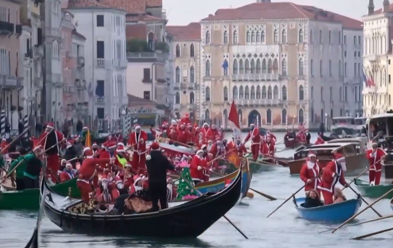 Περίπου εκατό Άγιοι Βασίληδες έφτασαν στην πόλη της λιμνοθάλασσας, με βάρκες και γόνδολες, χρωματίζοντας κόκκινο το Μεγάλο Κανάλι και φέρνοντας χαρά και μαγεία στην πόλη μια εβδομάδα πριν από τα Χριστούγεννα, στο πλαίσιο του προγράμματος «Η Βενετία φωτίζει τα Χριστούγεννα».