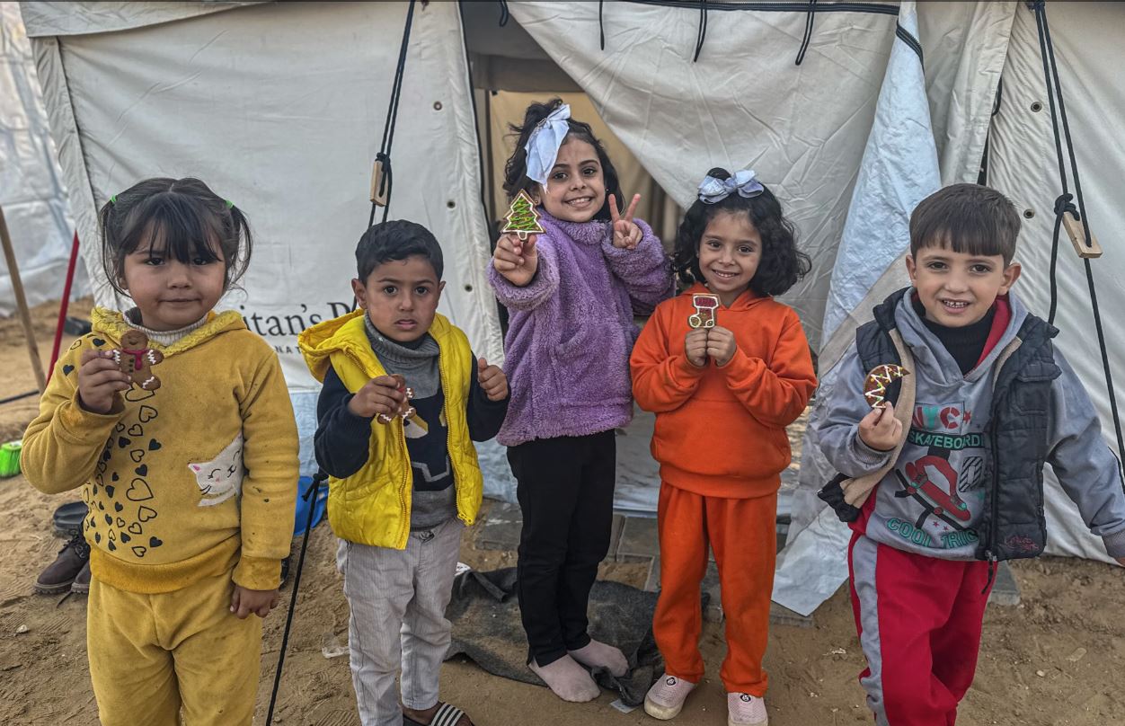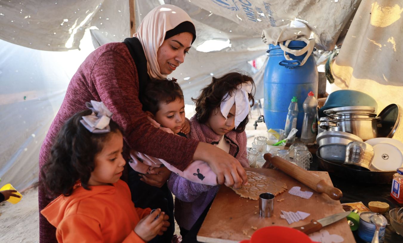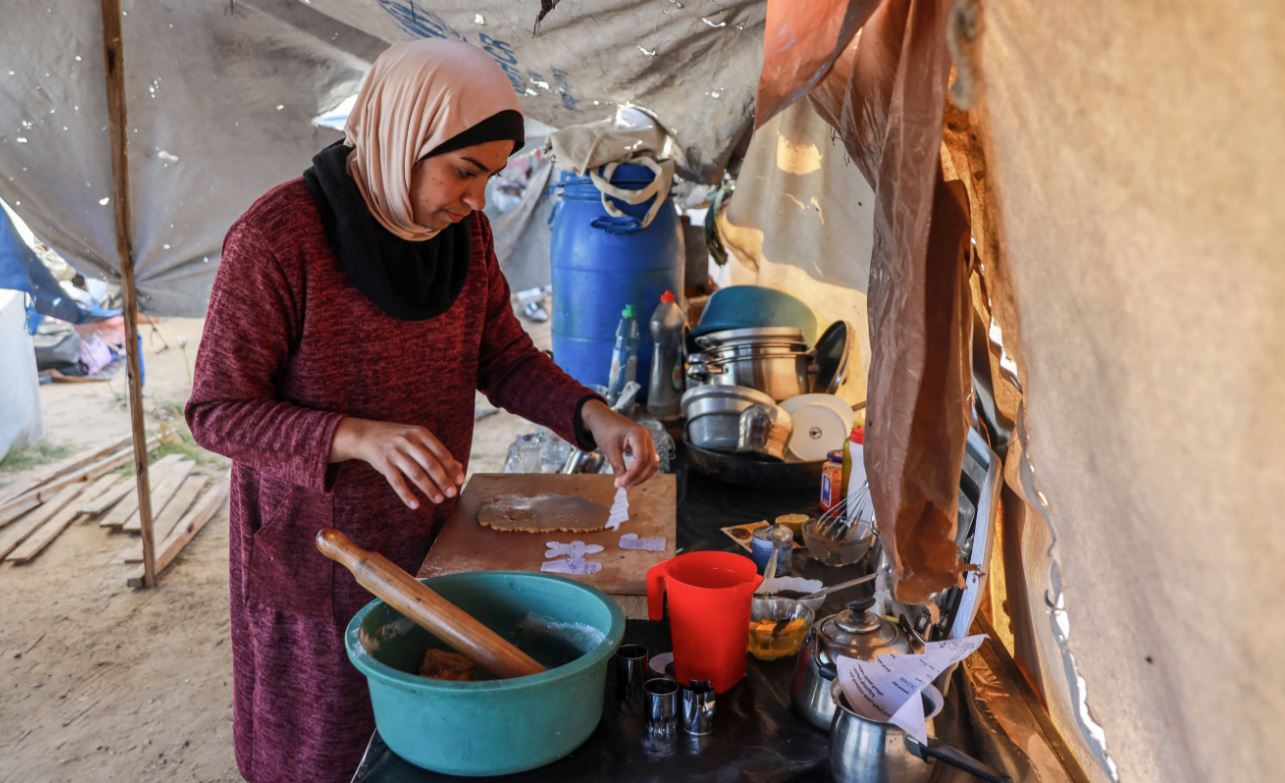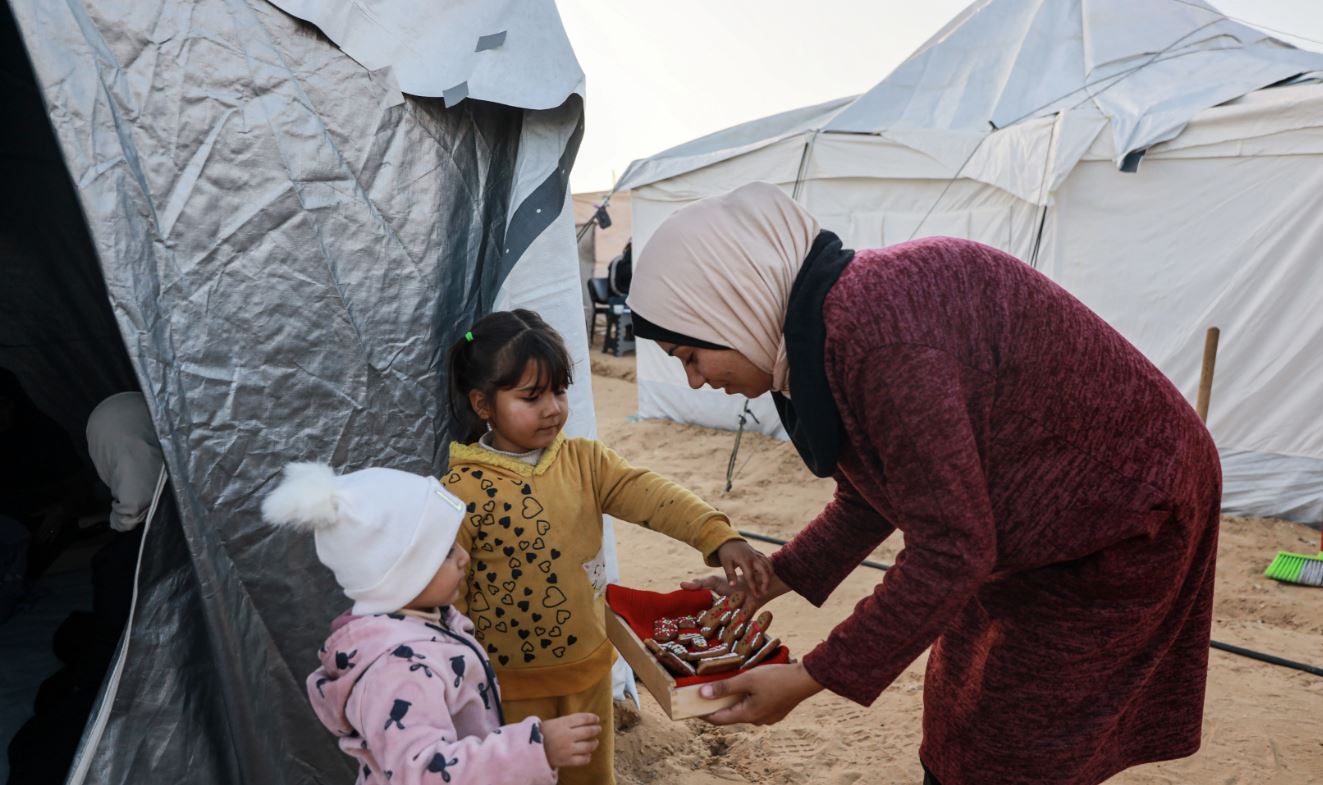 Σε μια αυτοσχέδια κουζίνα μέσα σε μια σκηνή, χωρίς τον απαραίτητο βασικό εξοπλισμό, η Mayess Hamid από την Γάζα ετοίμασε φέτος χριστουγεννιάτικα μπισκότα για να δώσει λίγη χαρά στα παιδιά της και τα παιδιά των γύρω της.
