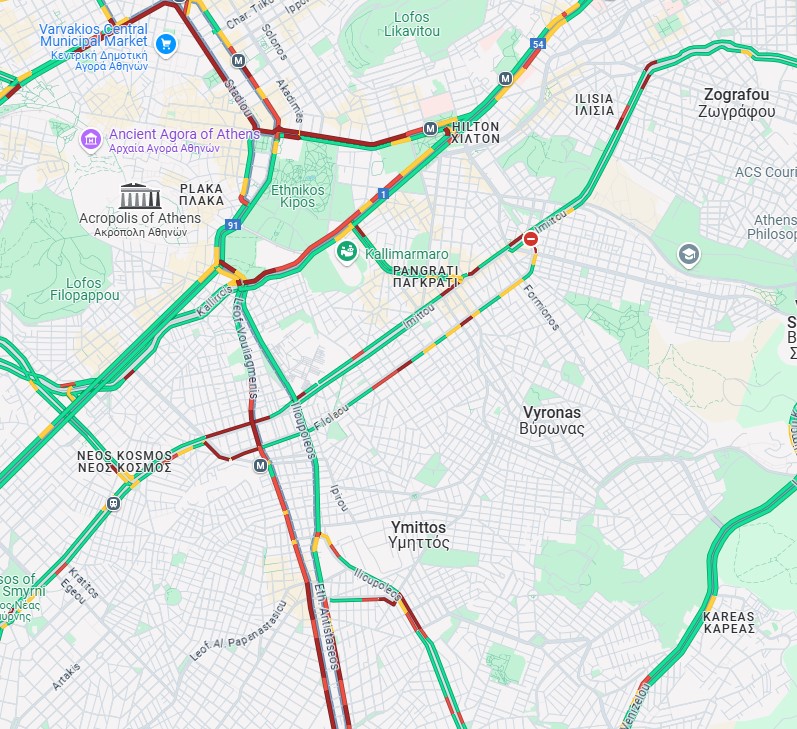 Με προβλήματα διεξάγεται η κυκλοφορία και επί της λεωφόρου Β. Σοφίας στο ρεύμα προς Αθήνα, από το ύψος του Χίλτον, ενώ στο κόκκινο βρίσκεται και η Σταδίου στο ρεύμα προς Αθήνα.