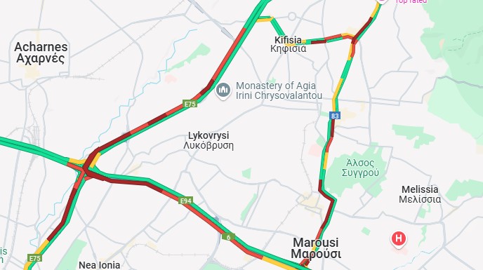 Στην Κηφισιά οι δυσκολίες ξεκινούν από το Ζηρίνειο μέχρι και το Κεφαλάρι, ενώ πολύ αυξημένη κίνηση συναντούν οι οδηγοί και στην περιοχή της Νέας Ερυθραίας από τη Χαριλάου Τρικούπη στο ρεύμα προς Πολιτεία.