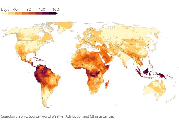 Στη συνέχεια, οι ερευνητές συνέκριναν τον αριθμό των ημερών που υπερβαίνουν αυτό το όριο το 2024, με εκείνες σε ένα σενάριο χωρίς παγκόσμια θέρμανση, για να υπολογίσουν πόσες επιπλέον ζεστές ημέρες προκλήθηκαν από την κλιματική κρίση.