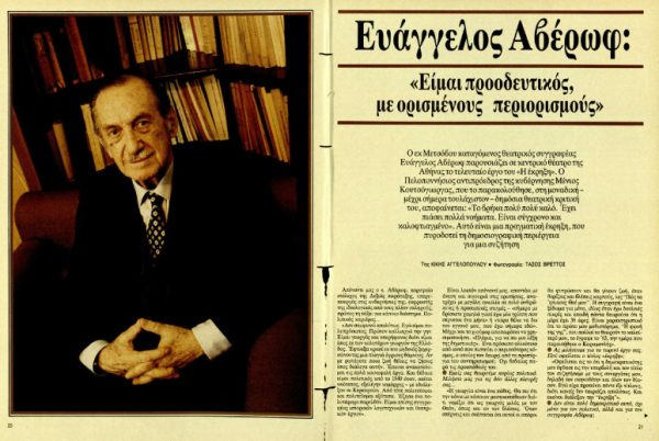 *Άρθρο αφιερωμένο στον αείμνηστο Ευάγγελο Αβέρωφ – Τοσίτσα, που έφερε τον τίτλο «Είμαι προοδευτικός, με ορισμένους περιορισμούς» και είχε δημοσιευτεί στον «Ταχυδρόμο» στις 14 Ιανουαρίου 1988. Ο μετσοβίτικης καταγωγής Αβέρωφ είχε παραχωρήσει την ανωτέρω συνέντευξη στη δημοσιογράφο Κική Αγγελοπούλου με αφορμή το ανέβασμα του θεατρικού έργου του «Η έκρηξη» σε κεντρικό θέατρο της Αθήνας.