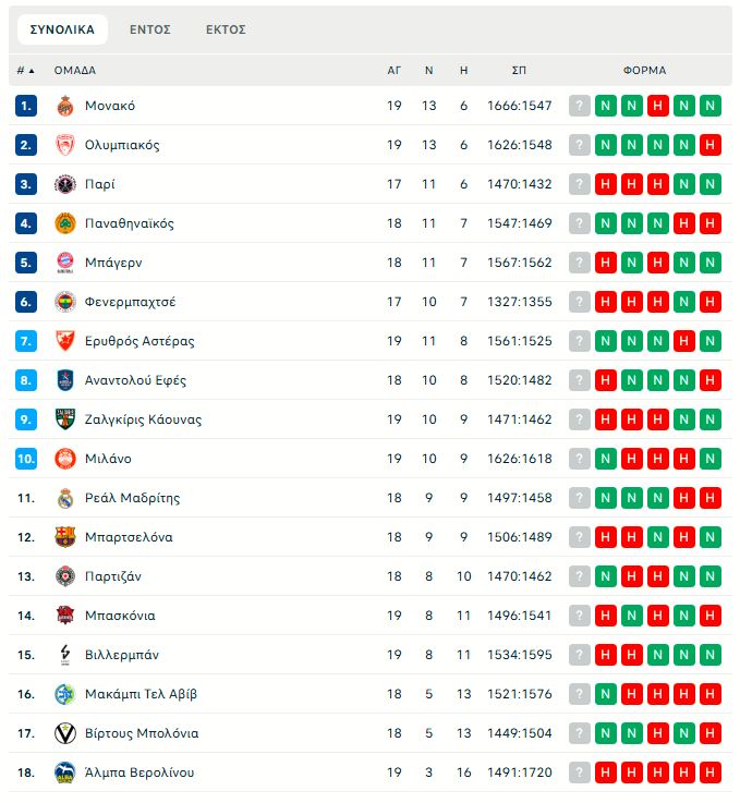 Οι «ερυθρόλευκοι» βελτίωσαν το ρεκόρ τους σε 13-6 και βρίσκονται στην κορυφή της βαθμολογίας. Βέβαια, οι άλλες ομάδες απο κάτω τους έχουν ένα (ή και δύο μερικές) ματς λιγότερο, καθώς το ματς στο Κάουνας ήταν το πρώτο της 19ης αγωνιστικής. Ο τέταρτος Παναθηναϊκός (11-7) θα αντιμετωπίσει αύριο Παρασκευή (3/1, 21:15) τη Βίρτους Μπολόνια στο ΟΑΚΑ.