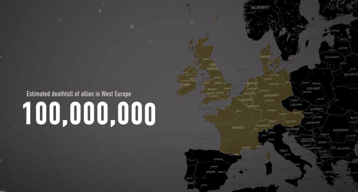 Στιγμιότυπο από το ντοκιμαντέρ που δείχνει τις χώρες της Δυτικής Ευρώπης που θα έβλεπαν 100.000.000 ανθρώπους να πεθαίνουν ως παράπλευρες απώλειες των Αμερικανών.