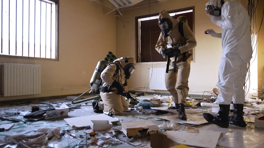 Αλλά η ασφάλεια της τοποθεσίας και των χημικών που περιέχει είναι μια εξαιρετικά επικίνδυνη αποστολή. Οι εθελοντές ήσαν ντυμένοι με προστατευτικό εξοπλισμό απ’ την κορφή ως τα νύχια. Όμως, με το θρυμματισμένο γυαλί να καλύπτει το πάτωμα του κτηρίου, έπρεπε να είναι εξαιρετικά προσεκτικοί, καθώς ακόμη κι ένα μικρό σκίσιμο στην ειδική στολή θα μπορούσε ν’ αποβεί μοιραίο.