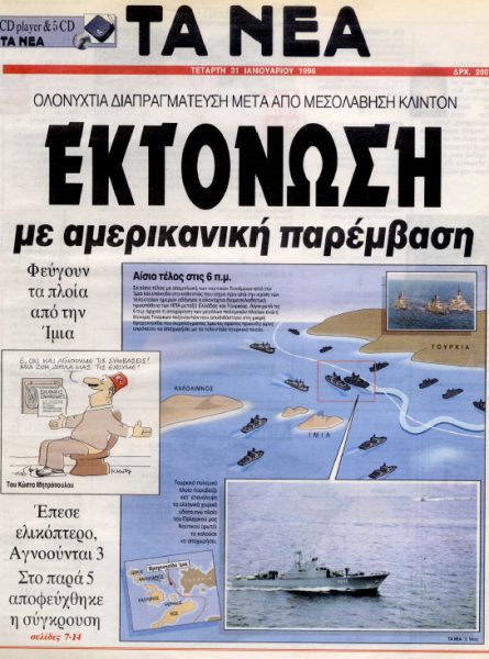 «Ο πρόεδρος Κλίντον με πληροφορεί ότι ανησυχεί μήπως η κρίση στα Ίμια οδηγήσει σε θερμό επεισόδιο μεταξύ των δύο χωρών και συμβουλεύει να πάρουμε τα αναγκαία μέτρα ώστε να αποφευχθεί μια πολεμική σύγκρουση. Από τη συνομιλία μας σχημάτισα την εντύπωση ότι η ενημέρωσή του ήταν ελλιπής. Του απάντησα ότι Ίμια ανήκουν στην Ελλάδα» είχε δηλώσει τότε ο Κώστας Σημίτης.