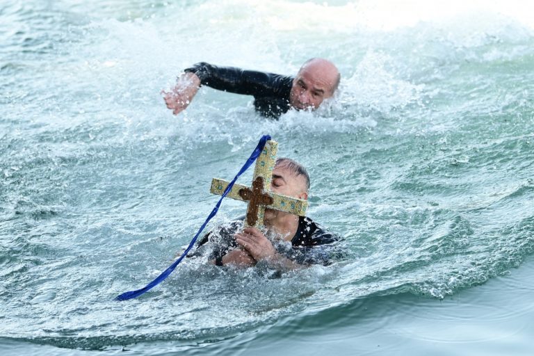 Μέλη του συνδέσμου ελλήνων βατραχανθρώπων βούτηξαν στα παγωμένα νερά του λιμανιού για να πιάσουν τον τίμιο σταυρό.