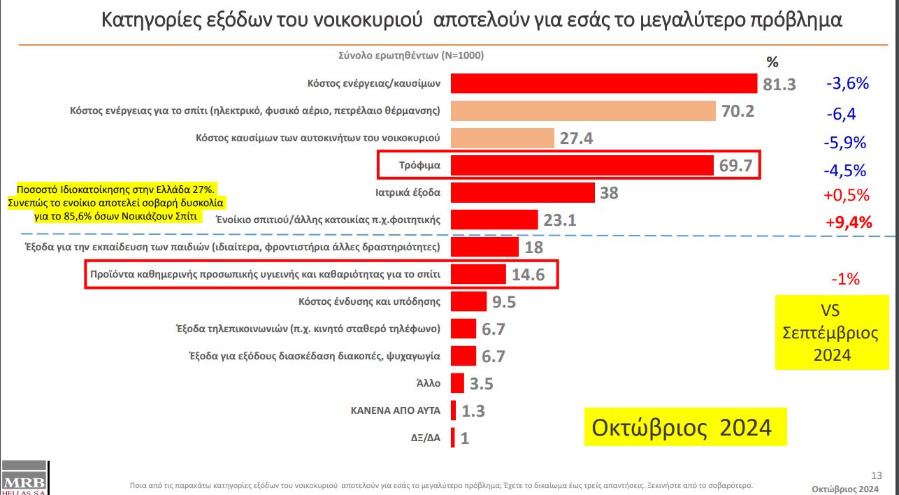 Σε σχετική έρευνα της ΜRB για την ακρίβεια (Οκτώβριος 2024), στο ερώτημα «ποιες από τις παρακάτω κατηγορίες αποτελούν για σας μεγαλύτερο πρόβλημα», το 81,3% ανέφερε ως μεγαλύτερη πληγή το κόστος της ενέργειας και των καυσίμων. Το 70,2% ανέφερε ως σημαντικότερο πρόβλημα το κόστος ενέργειας του νοικοκυριού. Τα τρόφιμα είναι το μεγαλύτερο πρόβλημα για το 69,7% – ποσοστό που βρίσκεται σε πολύ υψηλά επίπεδα αλλά βαίνει μειούμενο.