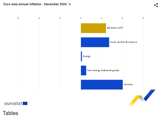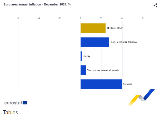 Όσον αφορά τις κύριες συνιστώσες του πληθωρισμού της ζώνης του ευρώ, οι υπηρεσίες είχαν τον υψηλότερο ετήσιο ρυθμό τον Δεκέμβριο (4,0%, έναντι 3,9% τον Νοέμβριο), ακολουθούμενες από τα τρόφιμα, αλκοόλ και καπνό (2,7%, σταθερό σε σύγκριση με τον Νοέμβριο), τα μη ενεργειακά βιομηχανικά αγαθά (0,5%, έναντι 0,6% τον Νοέμβριο) και την ενέργεια (0,1%, έναντι -2,0% τον Νοέμβριο).