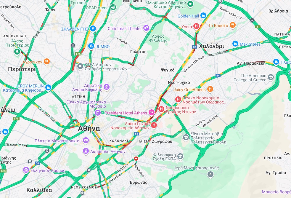 Καθυστερήσεις 25΄-30΄από κόμβο Πεντέλης έως την έξοδο για Λαμία στο ρεύμα προς Ελευσίνα.