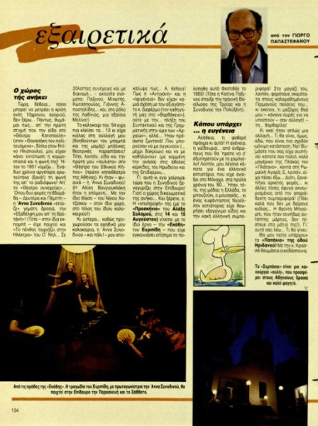 Κι ύστερα, καθώς προχωρούσαν τα εφηβικά μου καλοκαίρια, η Άννα Συνοδινού —και πάλι!— μου αποκάλυψε πως… Α, βέβαια! Πως η «Αντιγόνη» και η «Ιφιγένεια» δεν είχαν καμιά σχέση με τον αξιαγάπητο κ. Δαφέρμο (τον καθηγητή μας στο «Βαρβάκειο»), ούτε με την πλήξη του Συντακτικού και της Γραμματικής στην ώρα των «Αρχαίων», αλλά… Ήταν πρόσωπα ζωντανά! Που μπορούσαν να με συγκινούν (μέχρι δακρύων) και να με καθηλώνουν (με κομμένη την ανάσα) στις άβολες κερκίδες, του Ηρωδείου και της Επιδαύρου.
