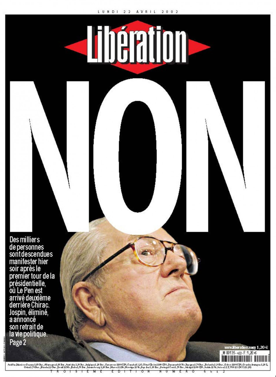 Στην πρώτη σελίδα της έκδοσης της Libération στις 22 Απριλίου 2002, ο τίτλος έγραφε με κεφαλαία γράμματα «ΟΧΙ», καθώς ο Λεπέν είχε περάσει στο β’ γύρο των εκλογών απέναντι στον Σιράκ