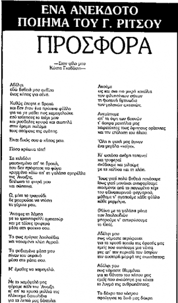Το κείμενο της συνέντευξης του Γιάννη Γκοβόστη και της μητέρας του, Ελένης, συμπλήρωνε ένα ανέκδοτο ποίημα του Γιάννη Ρίτσου, αφιερωμένο στο φίλο του Κώστα Γκοβόστη. Είναι αυτό ακριβώς που εκτίθεται ανωτέρω, σε δύο μέρη.