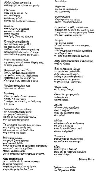 Είχαμε αρχίσει να του βγάζουμε τα Άπαντα. Είχε γράψει και πρόλογο. Μα ήρθε και ο πόλεμος και δεν συνεχίσαμε. Ήταν σε πολύ ωραίο σχήμα, όπως είχαμε βγάλει τον Καρυωτάκη, σε καλό χαρτί. Δεν ξέρω πώς ο άνδρας μου τότε, μες στην αναμπουμπούλα και τον πόλεμο, έκανε την κουταμάρα και το έδωσε σαν χαρτί με το κιλό. Τελευταία, μου έλεγε ο Γιώργος Σαββίδης ότι βρήκε τα 4-5 πρώτα τυπογραφικά…»