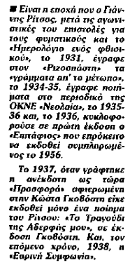 Όλα αυτά τα βιβλία τα παλιά ήταν λοιπόν αδύνατο να ξαναγίνουν. Γιατί, μοιραία, ό,τι βγαίνει τώρα πρέπει νάναι πέντε-έξι σκάλες πιο κάτω. Γιατί πώς να ξαναμαζέψεις τώρα τον Ρίτσο, τον Ζενάκο, τον Σέργιο Πρωτόπαπα, την Μπιτζιλέκη, τον Νότη Παναγιώτου και να τους βάλεις να σου διυλίζουνε την κάθε αράδα;