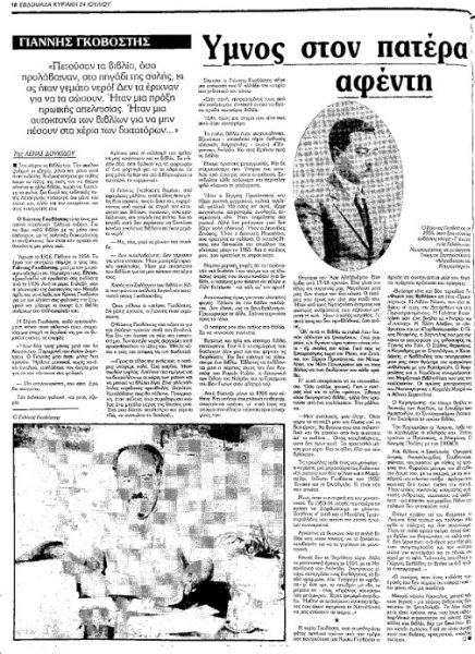 *Άρθρο αφιερωμένο στον εκδοτικό οίκο Γκοβόστη με την υπογραφή της δημοσιογράφου και συγγραφέως Λένας Δουκίδου (1934-2020). Έφερε τον τίτλο «Ύμνος στον πατέρα αφέντη» και είχε δημοσιευτεί στην εφημερίδα «Το Βήμα» την Κυριακή 24 Ιουλίου 1983.
