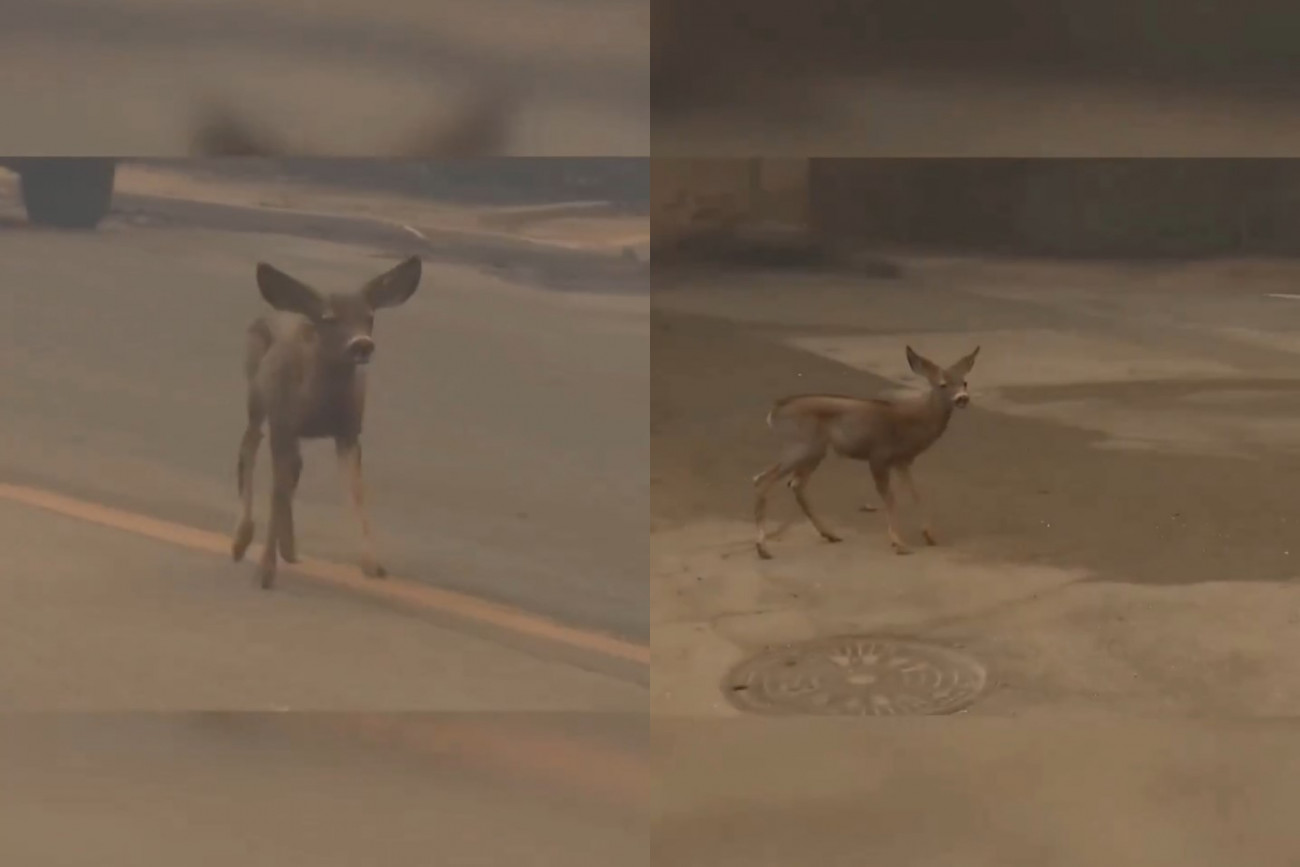 Το βίντεο, που έγινε viral, δείχνει το ελαφάκι να τρέχει πανικόβλητο κατά μήκος του δρόμου. Καταγράφονται επίσης πυκνοί καπνοί και αρκετά οχήματα σταθμευμένα στην περιοχή.