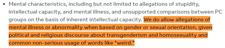 «Επιτρέπουμε κατηγορίες για ψυχική ασθένεια ή ανωμαλία όταν βασίζονται στον σεξουαλικό προσανατολισμό, δεδομένης της δημόσιας συζήτησης γύρω από τη διεμφυλικότητα και την ομοφυλοφιλία σε πολιτικό και θρησκευτικό επίπεδο, όπως και τη συχνή, μη κυριολεκτική χρήση της λέξης »περίεργος»», αναφέρει το πλαίσιο των αλλαγών.