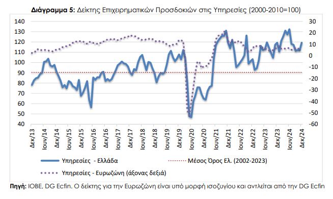 Συνολικά για το 2024 ο μέσος όρος του δείκτη κινείται σχεδόν στις 108 μονάδες, επίπεδο υψηλότερο από το αντίστοιχο 107,6 του 2023 και ταυτόχρονα το υψηλότερο μετά την οικονομική κρίση που ξεκίνησε το 2008. Σύμφωνα με το ΙΟΒΕ, η σχετικά βελτιωμένη εικόνα προέρχεται από τις επιχειρήσεις, καθώς οι προσδοκίες στους περισσότερους κλάδους ήταν γενικά ικανοποιητικές κατά τη διάρκεια του έτους.