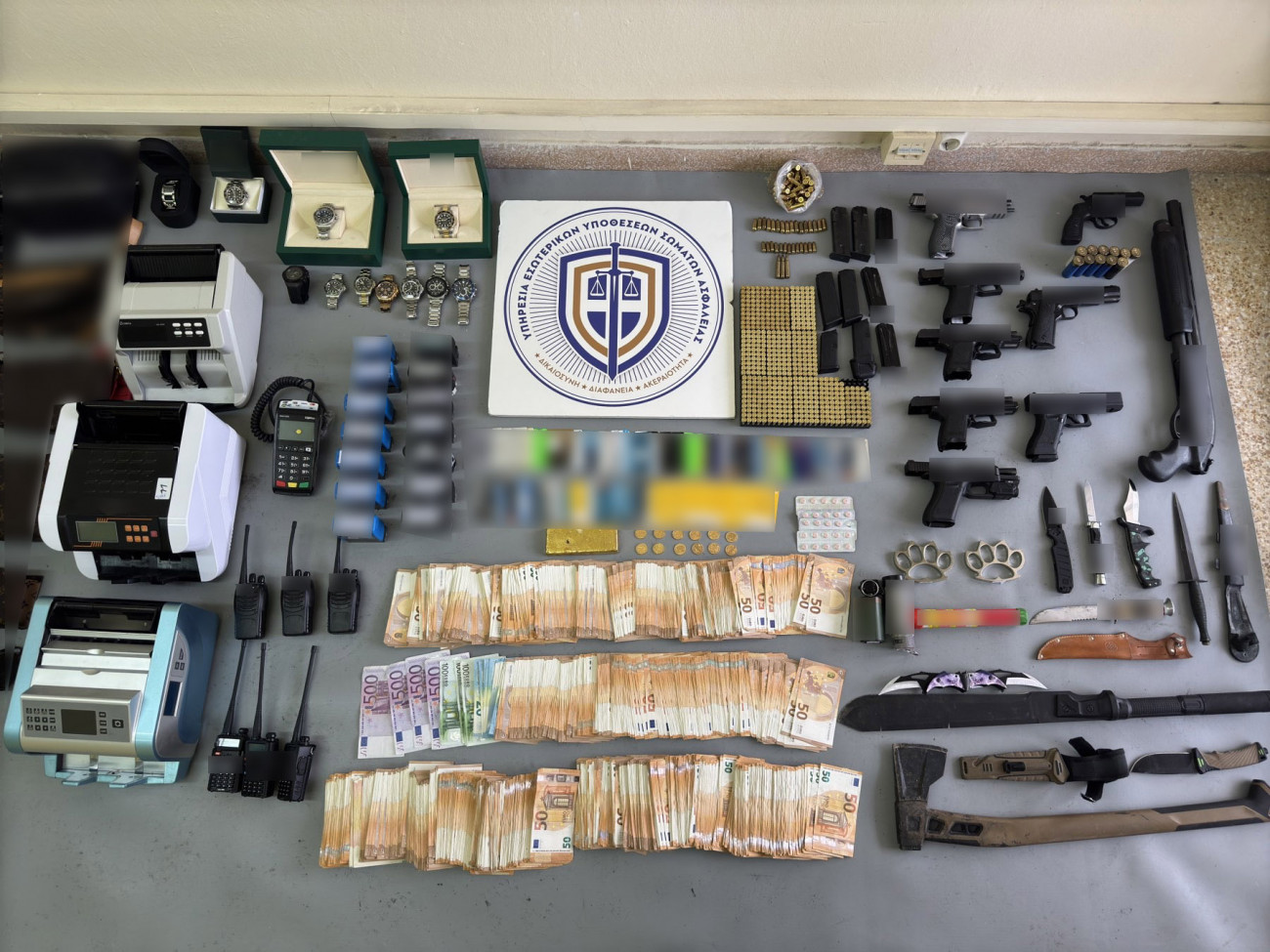 Επίσης βρέθηκαν μεγάλα χρηματικά ποσά, μετρητές χαρτονομισμάτων, διάφορες σφραγίδες, ασύρματοι και ρολόγια αξίας.