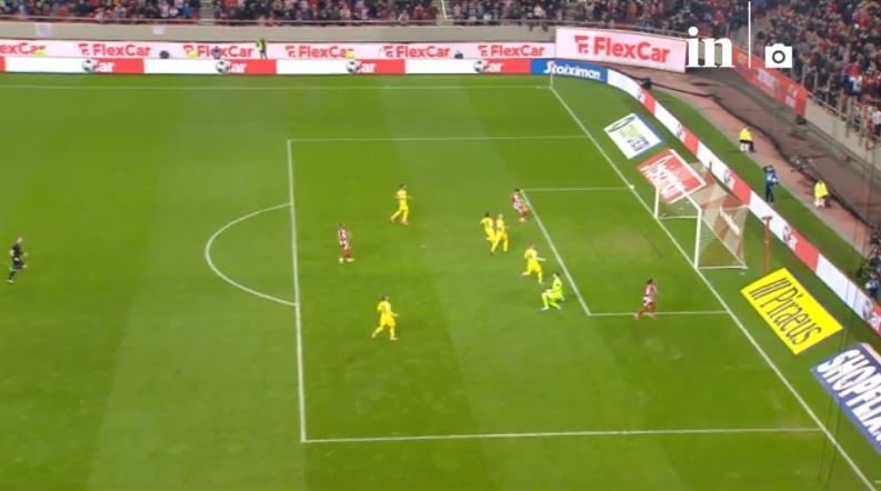 Ο εξτρέμ της ομάδας του Πειραιά βρέθηκε σε καλή θέση στην περιοχή από δεξιά, πλάσαρε τον Κουέστα αλλά ο τερματοφύλακας του Άρη απέκρουσε σε κόρνερ.