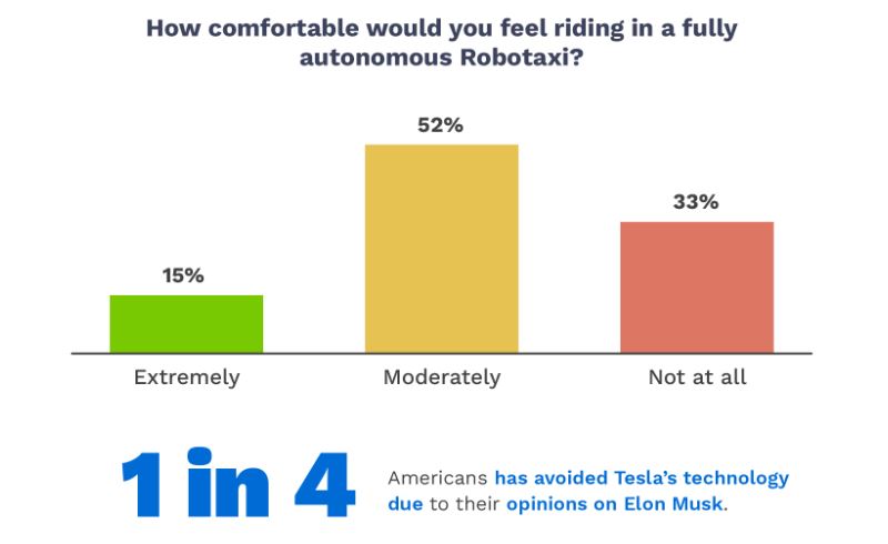 Πάνω από 1 στους 2 Αμερικανούς θα έμπαινε σε αυτοκινούμενο Robotaxi της Tesla. Ένας στους τέσσερις Αμερικανούς θα προτιμούσε ένα Robotaxi από ένα παραδοσιακό σύστημα κοινής χρήσης. Ένας στους τέσσερις Αμερικανούς αποφεύγει την τεχνολογία της Tesla λόγω των απόψεών του για τον Μασκ. Σχεδόν 1 στους 5 Αμερικανούς είναι ανοιχτός στο να πουλήσει το όχημά του και να βασιστεί στο Robotaxi.