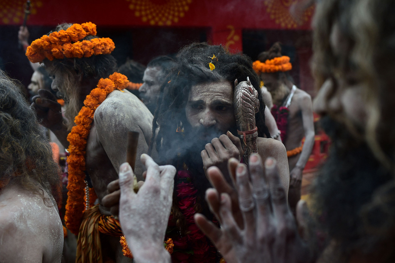 Ανάμεσα στο πλήθος, μοναχοί ντυμένοι με πορτοκαλί ενδύματα -το χρώμα του ινδουισμού- και ασκητές με το σώμα τους μαυρισμένο από στάχτες μοιράζουν ευλογίες.