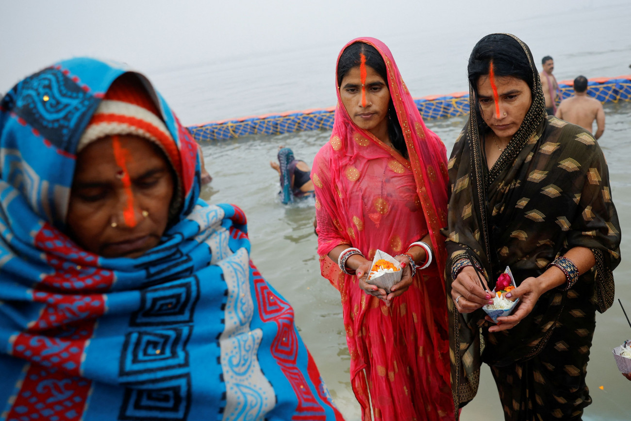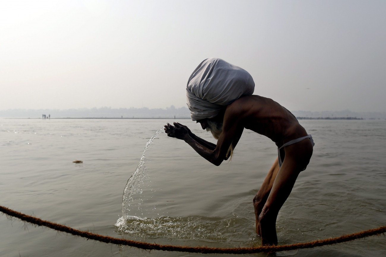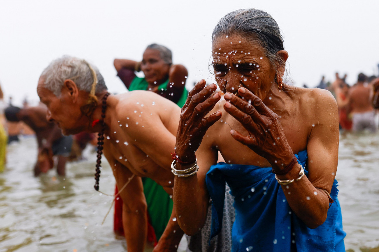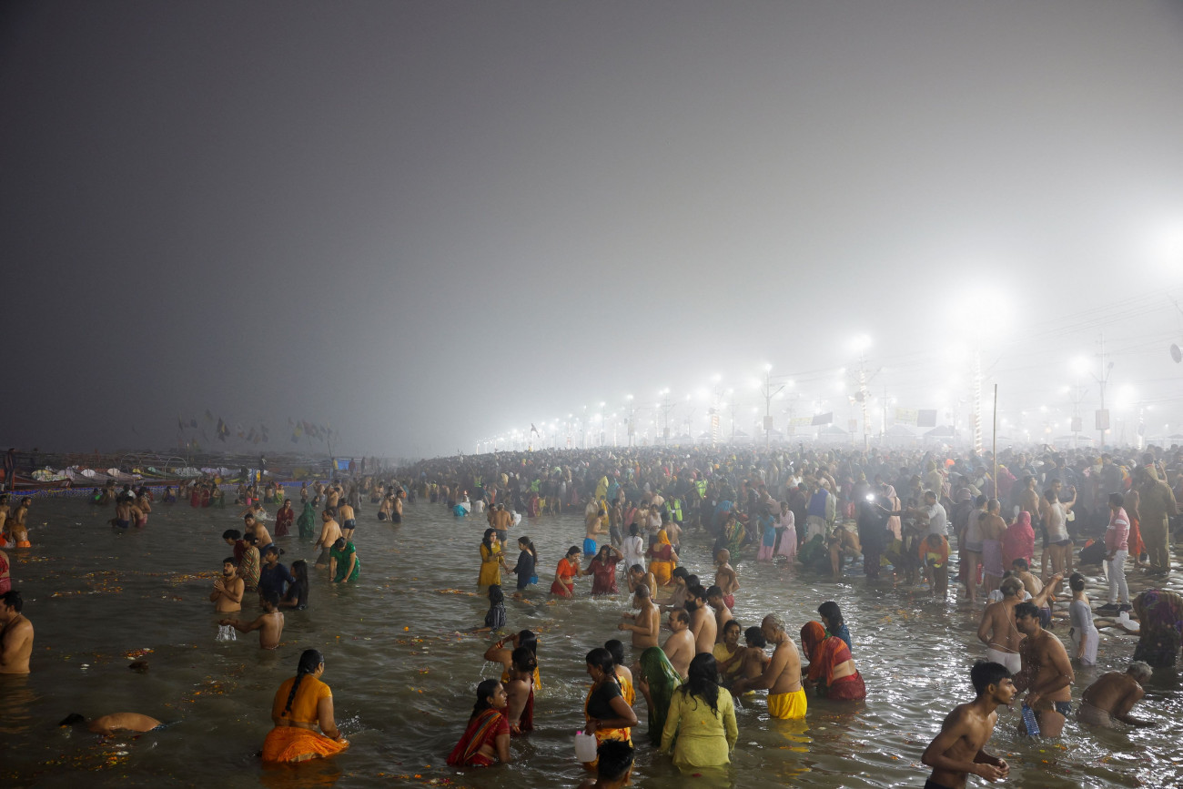 Πριν καν βγει ο ήλιος, οι πρώτες ομάδες προσκυνητών μπήκαν στα παγωμένα νερά, στο σημείο όπου ενώνονται οι ιεροί ποταμοί Γάγγης, Γιαμούνα και ο μυθικός Σαρασβάτι, για να ξεπλύνουν τις αμαρτίες τους, όπως απαιτεί η ινδουιστική παράδοση.