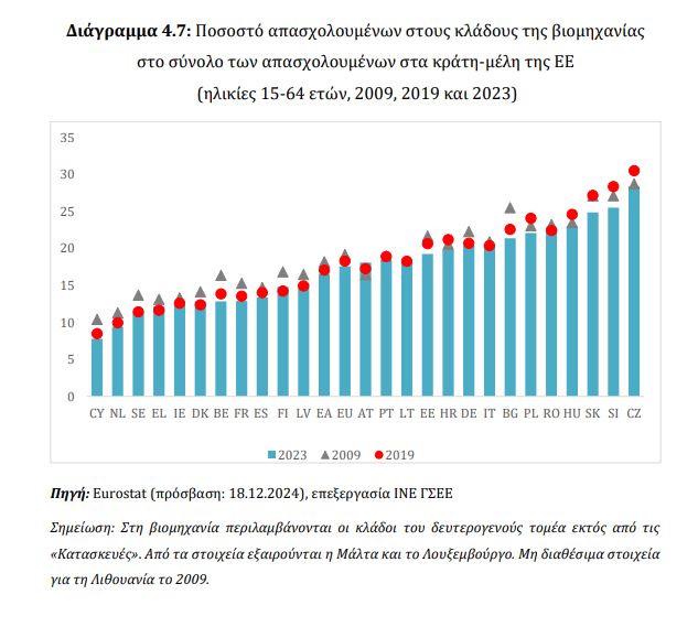 Η Ελλάδα έχει διαχρονικά από τα χαμηλότερα ποσοστά απασχολούμενων στη βιομηχανία στην ΕΕ