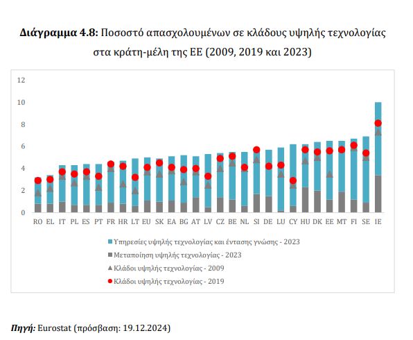 Μόλις το 3,4 των εργαζομένων δουλεύουν σε κλάδους ή σε θέσεις που αξιοποιούν την υψηλή τεχνολογία, το χαμηλότερο ποσοστό πανευρωπαϊκά μετά τη Ρουμανία. Όσο για τη μεταποίηση υψηλής τεχνολογίας, αφορά μόνο το 0,8% του συνόλου των απασχολουμένων, ποσοστό που κατατάσσει την Ελλάδα στις τελευταίες θέσεις των καρτών της ΕΕ.