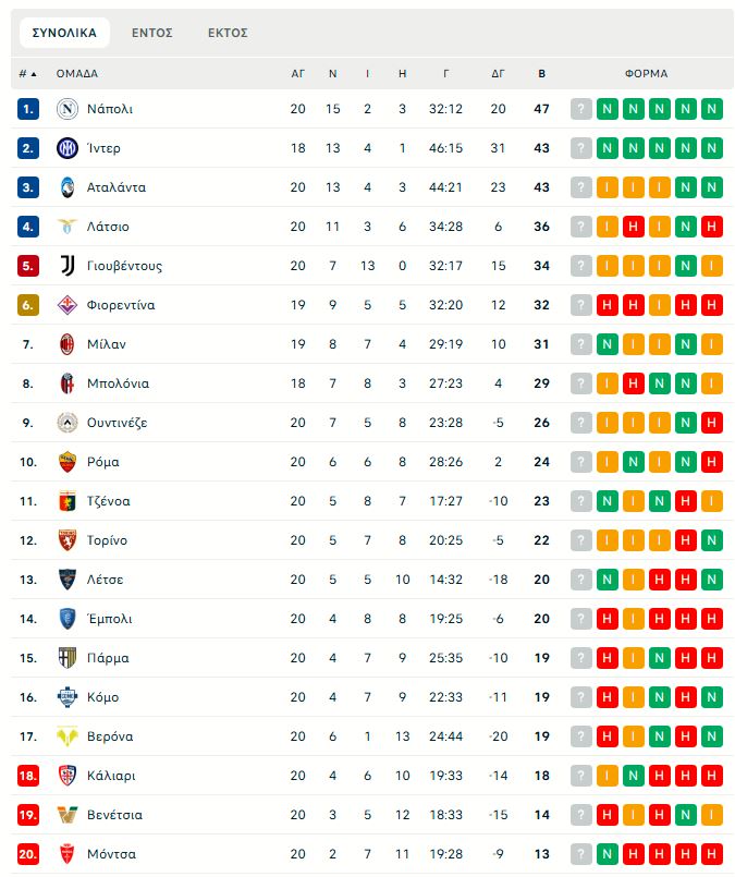Το εξ αναβολής ντέρμπι της 19ης αγωνιστικής, ανάμεσα στην Αταλάντα και στη Γιουβέντους δεν ανέδειξε νικητή. Το τελικό 1-1 δεν ικανοποίησε καμία από τις δύο ομάδες, τη γηπεδούχο Αταλάντα διότι έχασε δύο υπερπολύτιμους βαθμούς στη μάχη του τίτλου, ενώ η «Γιουβε» δεν κατάφερε να «πιάσει» την Λάτσιο στην 4η θέση.