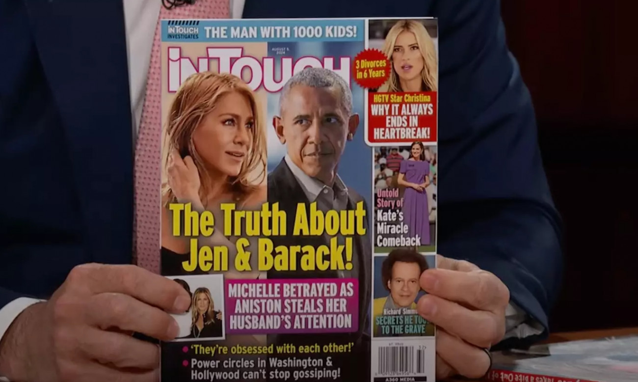 «Το τρέχον τεύχος του περιοδικού People αποκάλυψε αυτό που η Ουάσιγκτον ήξερε ούτως ή άλλως: ότι ο Μπαράκ Ομπάμα είχε σχέση με την Τζένιφερ Άνιστον. Η αποκάλυψη ήρθε στο φως παρά τις αξιόπιστες προσπάθειες του προέδρου για διακριτικότητα. Ο Μπαράκ Ομπάμα επισκέφτηκε το διαμέρισμα της κυρίας Άνιστον το βράδυ και έφυγε το πρωί (αφού τους είχε φέρει bagels η Μυστική του Υπηρεσία) με ένα σκούτερ, φορώντας ένα κράνος με το γείσο κάτω για να κρύψει το πρόσωπό του».