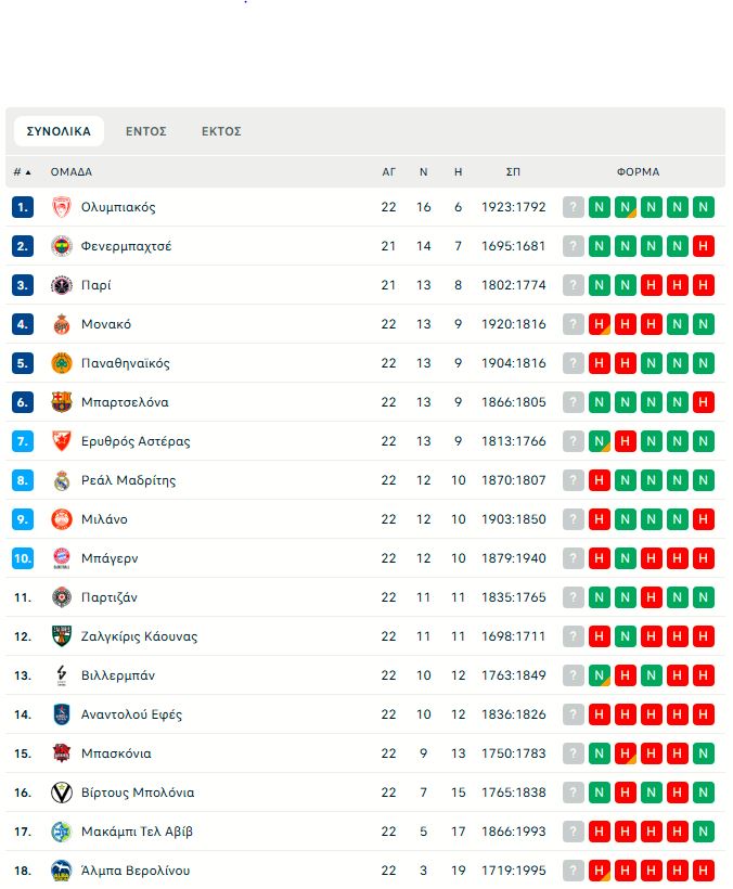 Euroleague: Η βαθμολογία μετά τη νέα ήττα του Παναθηναϊκού στην Ισπανία