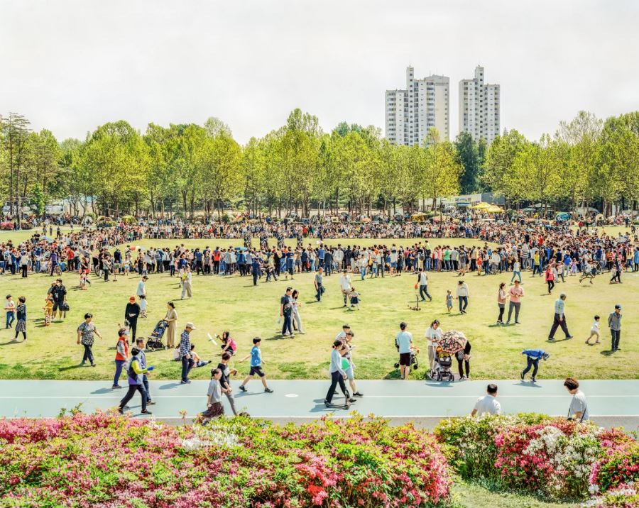 Οι πολλές ώρες εργασίας και τα μικρά διαλείμματα έχουν οδηγήσει πολλούς Κορεάτες να ζουν κοντά στα αστικά κέντρα, με πάνω από το 80% του πληθυσμού να ζει στις πόλεις. Και μέσα στις φωτογραφίες του Kim Seunggu υπάρχει μια ενδιαφέρουσα δυαδικότητα – μια ένταση μεταξύ του καταπιεστικού αστικού τοπίου και των πολύχρωμων δραστηριοτήτων αναψυχής των κατοίκων του.