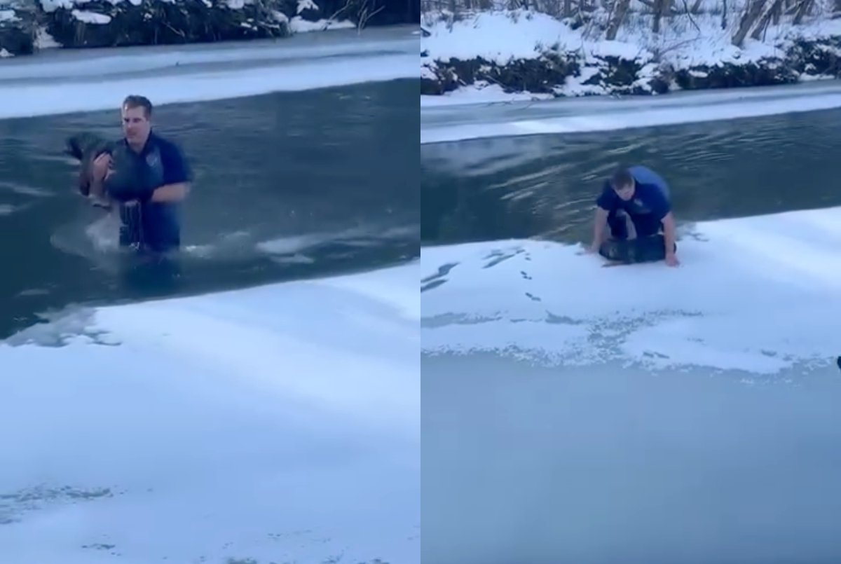 Χωρίς δεύτερη σκέψη, βούτηξε στα παγωμένα νερά, πλησίασε προσεκτικά το τρομαγμένο ζώο και το έβγαλε με ασφάλεια στην ακτή. Εκεί, η σύζυγός του, Erica, το σκέπασε με ένα φούτερ για να το ζεστάνει. Το περιστατικό συνέβη το απόγευμα της Παρασκευής στο Βερολίνο του Βερμόντ και συγκίνησε πλήθος ανθρώπων στο διαδίκτυο.